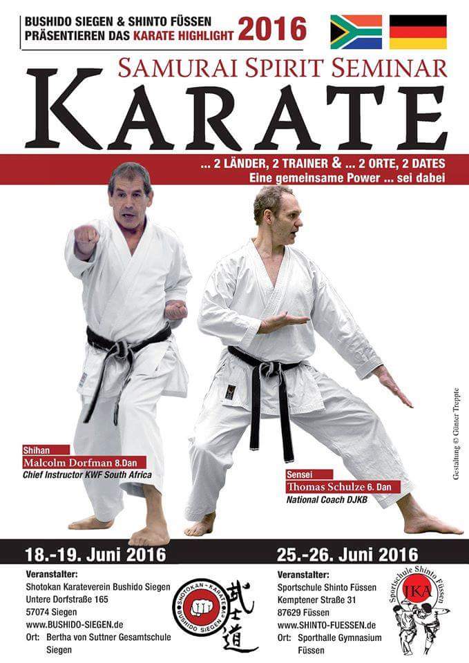 Już jutro (17 czerwca 2016 r.) ekipa KWF Poland w składzie: Lars Lassen Sensei, Adam Milczarek, Jakub Bobrowski i Kamil Bobrowski wyrusza do niemieckiego Siegen, aby uczestniczyć w seminarium z Shihan Malcolmem Dorfmanem 8 Dan KWF Zastępcą Instruktora Głównego KWF, Główny Intruktor KWF w RPA. Seminarium to będzie wyjątkową okazją do treningu z legendą światowego karate shotokan. Warto w tym miejscu zaznaczyć, iż Malcolm Dorfman Sensei jest jedynym niejapończykiem, który uzyskał z rąk Masatoshi Nakayamy Sensei stopień 6 Dan,